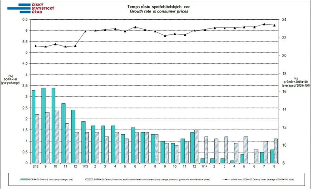Míra inflace vyjádřená přírůstkem průměrného indexu spotřebitelských cen za posledních 12 měsíců proti průměru předchozích 12 měsíců byla v srpnu 0,5 %.