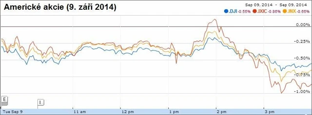 Americké akciové indexy pokračovaly v poklesu z maxim z minulého týdne. Investoři se obávají dřívějšího zahájení zvyšování sazeb ze strany Fedu. Akcie Applu přišly během dne o zisky po představení nových produktů.