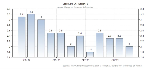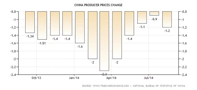 Index spotřebitelských cen v Číně v srpnu narostl jen o 2 %, čekal se růst o 2,2 % po červencových 2,3 %. Index cen výrobců se stále nevymanil z deflační spirály a klesl o 1,2 %, čekalo se jen -1,1 % po -0,9 % v červenci.