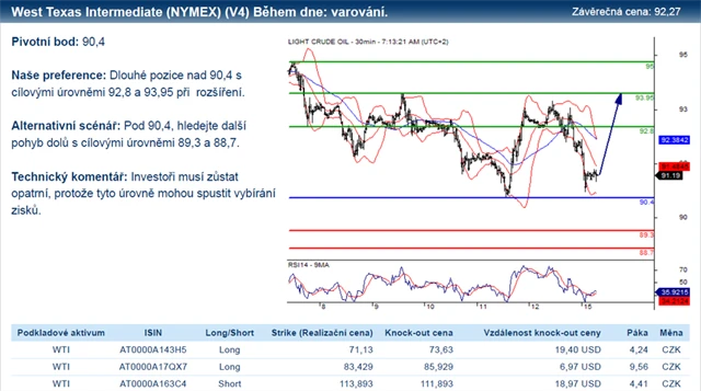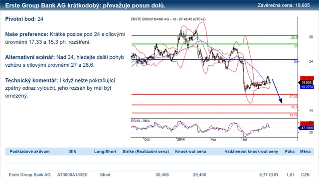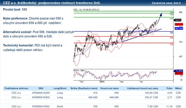 Technická analýza: ČEZ, Erste, WTI, zlato (15. 9. 2014)Krátkodobý technický výhled včetně certifikátů, s nimiž na něj lze vsadit. (15. 9. 2014) Redakce IW15. 9. 2014 | 10:30Technická analýzaČEZ Erste Group Bank Ropa WTI Zlato Zdroj: Trading CentralCertifikátyČEZErste Group BankRopa WTISpekulaceTechnická analýzaZlatoRedakce IW Další články autoraTrump: Dohoda s Čínou je na světě, vzácné zeminy budeme dále řešit na roční báziPřevodem do nového penzijka lze získat až stovky tisíc navíc. A není to nic složitéhoTOP 10 článků týdne: Zlaté vystřízlivění, AI bublina a evropské zbrojovkyDoporučujemePod zbožňovaným Applem se kýve židle. Pokud se firma neprobere, může dopadnout jako NokiaApple Nestihli jste naskočit do zlaté rally? Vůbec není pozdě, říká stratégZlatoAuto jako služba: Operativní leasing stále více láká domácnostiFinanční sektor Aktualitydnes | 16:03Cena akcií Chipotle se propadla až o 19 % po snížení celoroční prognózy tržebdnes | 15:47Core Scientific zablokovala převzetí ze strany CoreWeave po nesouhlasu akcionářůdnes | 15:33Stellantis zřídil krizový tým kvůli problémům s čipy od Nexperie, oznámil CEOdnes | 15:15Rusko varuje před odpovědí na Trumpův plán obnovit jaderné testy po více než 30 letechdnes | 14:55Meta plánuje prodejem dluhopisů získat nejméně 25 miliard dolarůdnes | 14:44Banka JPMorgan tokenizovala private equity fond na vlastní blockchainové platformědnes | 14:40Americké akcie v úvodu: Dow +0,49 %, S&P 500 -0,27 %, Nasdaq Composite -0,63 %dnes | 14:21Novo Nordisk a Pfizer soupeří o akvizici Metsery v boji o trh s léky na obezitudnes | 14:16ECB ani v říjnu na sazby nesáhla. Kvůli obchodním sporům a geopolitickému napětí ale podle ní přetrvává nejistotadnes | 13:59Německý autoprůmysl vytvoří dočasnou platformu pro sdílení informací o čipechdnes | 13:47Zisk Mastercard ve 3. čtvrtletí vzrostl na 3,9 miliardy dolarů, tržby stouply o 17 %dnes | 13:32Roblox zvyšuje celoroční výhled tržeb díky silné poptávce po virálních hráchZobrazit všechny aktuality Nejčtenější tento týden1.Pod zbožňovaným Applem se kýve židle. Pokud se firma neprobere, může dopadnout jako Nokia2.Nestihli jste naskočit do zlaté rally? Vůbec není pozdě, říká stratég3.Auto jako služba: Operativní leasing stále více láká domácnosti4.Čtyři důvody, proč po korekci nakupovat akcie evropských zbrojovek5.PwC spočítala, jaké by byly dopady ETS 2 v České republice6.Největší posun lidstva od podmanění si ohně: Kvantová revoluce je na spadnutí Sledujte násinvesticniweb.cz14000Investiční web19300LIVE2300Investiční web1000investicni_web500Investicniweb.cz33600