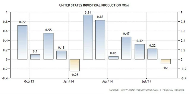 Produkce amerického průmyslu se v srpnu meziměsíčně snížila o 0,1 %, poprvé od ledna letošního roku, ačkoliv se očekával 0,3% růst. Červencový 0,4% růst byl navíc revidován níže na +0,2 %. Využití kapacit mělo mírně vzrůst na 79,3 % z červencových 79,1 % (revidováno z 79,2 %), namísto toho kleslo na 78,8 %. Výroba ve zpracovatelském sektoru se snížila o 0,4 %, čekal se růst o 0,2 % po červencových 0,7 % (revidováno z +1,0 %).
