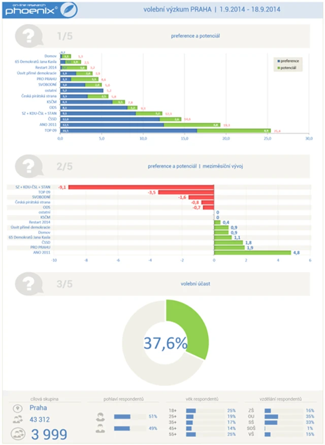 TOP 09 by v Praze i přes pokles voličské podpory oproti srpnovému měření obhájila vítězství z minulých komunálních voleb. V předvolebním výzkumu společnosti Phoenix research strana získala v celkovém součtu podporu 25,4 % respondentů, z toho 16,5 % činily preference a 8,9 % teoretický potenciál. Na stříbrnou pozici u pražských voličů vystoupalo hnutí ANO, které v celkovém souhrnu dosáhlo na 19,3 %. Třetí místo by obsadila ČSSD, která má podporu 14,6 % voličů.