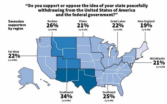 Oddělení podporují více voliči republikánů než demokratů, spíše mladí než staří lidé, chudší než bohatší a středoškoláci než vysokoškoláci. Ale v každé skupině bylo překvapivě hodně hlasů pro oddělení. A to nejen ve státech bývalé Konfederace na jihu USA, ale také ve státech ve Skalistých horách nebo třeba v Illinois nebo v Kansasu. Mezi podporovateli Tea Party bylo pro odtržení 53 % respondentů.