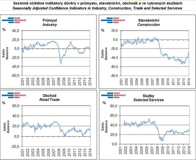 Celková důvěra v domácí ekonomiku se v září znovu nepatrně zvýšila. Souhrnný indikátor důvěry (indikátor ekonomického sentimentu) se ve srovnání se srpnem mírně zvýšil o 0,4 bodu. Indikátor důvěry podnikatelů se meziměsíčně zvýšil o 0,9 bodu. Mezi podnikateli se důvěra zvýšila ve stavebnictví, v průmyslu a v obchodě se zvýšila mírně a ve vybraných odvětvích služeb se nezměnila. Indikátor důvěry spotřebitelů se snížil. Ve srovnání s hodnotami v září 2013 jsou souhrnný indikátor důvěry, indikátor důvěry podnikatelů a indikátor důvěry spotřebitelů vyšší.