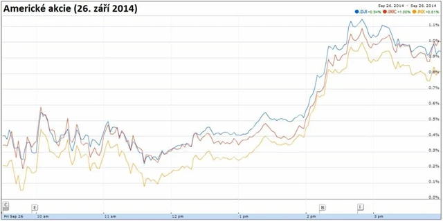 Dow posílil o 0,99 % na 17 113,15 bodu, širší S&P 500 přidal 0,86 % na 1 982,85 bodu a technologický Nasdaq uzavřel se ziskem 1,02 % na 4 512,19 bodu. V zelených číslech uzavřelo všech deset hlavních sektorů. Největší zisky si připsaly energetické tituly, akcie technologických společností a cenné papíry ze sektoru cyklického spotřebního zboží. Jen mírné zisky byly naopak k vidění v sektoru základních materiálů a odvětví služeb. Index volatility VIX klesl o 5,63 % na 14,76 bodu. Výnosy 10letých vládních dluhopisů USA vzrostly o tři bazické body na 2,53 %.