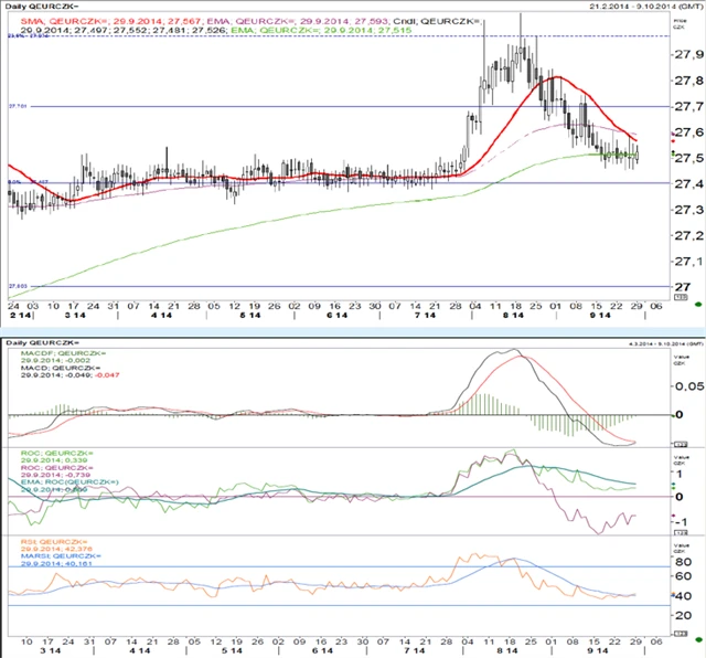 Pár konsoliduje na 200denním klouzavém průměru. MACD je v klesajícím trendu pod nulovou úrovní, ROC20 je přeprodaná v klesajícím trendu, ROC50 rovněž klesá a je pod nulou. RSI je ve zpomalujícím klesajícím trendu poblíž neutrální úrovně. Momentum je propoklesové. Trend by měl po konsolidaci pokračovat k hladině 27,40.