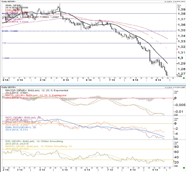 Pár se opět "naklání" směrem ke klesajícímu trendu. MACD je v postranním trendu a hluboce přeprodaná. Obě ROC stejně tak. Přeprodaný je také RSI. Momentum je silně propoklesové, ale euro je jednoznačně přeprodané. Z technického hlediska je pravděpodobná konsolidace nebo korekce.