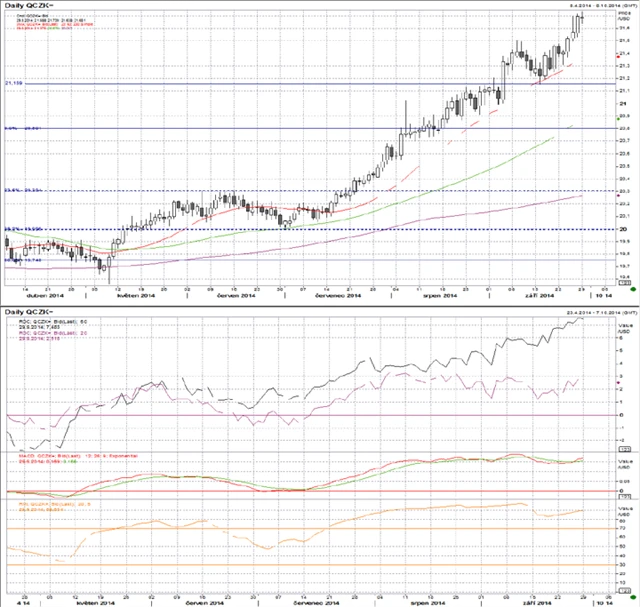 Pár směřuje k hladině 21,80. MACD je v mírném růstovém trendu a je překoupená. ROC20 je v postranním trendu a překoupená, ROC50 je v růstovém trendu a rovněž překoupená, stejně jako RSI. Momentum je sice jasně prorůstové, ale dolar je velmi silně překoupený. Hladina 21,80 by měla vyvolat další korekci.