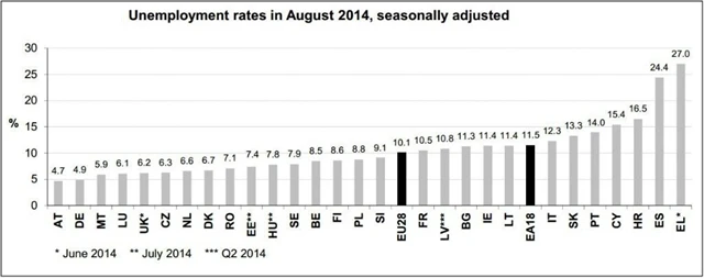 Nejnižší míru nezaměstnanosti vykázaly Rakousko (4,7 %) a Německo (4,9 %), nejvyšší naopak Řecko (27,0 % v červnu 2014) a Španělsko (24,4 %). Ve srovnání s minulým rokem, míra nezaměstnanosti klesla ve 22 členských státech, zvýšila se ve čtyřech a ve dvou zůstala stabilní.