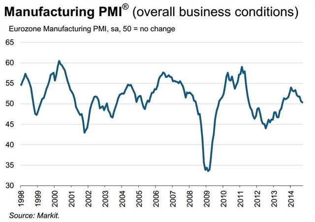 Expanze zpracovatelského sektoru v eurozóně v září zpomalila více, než se čekalo. Index nákupních manažerů spadl na 50,3 bodu ze srpnových 50,7 bodu, předběžná data přitom počítala s mírnější poklesem na 50,5 bodu. Indexy pro Řecko, Německo a Rakousko se propadly pod padesátibodovou hranici dělící kontrakci od expanze.