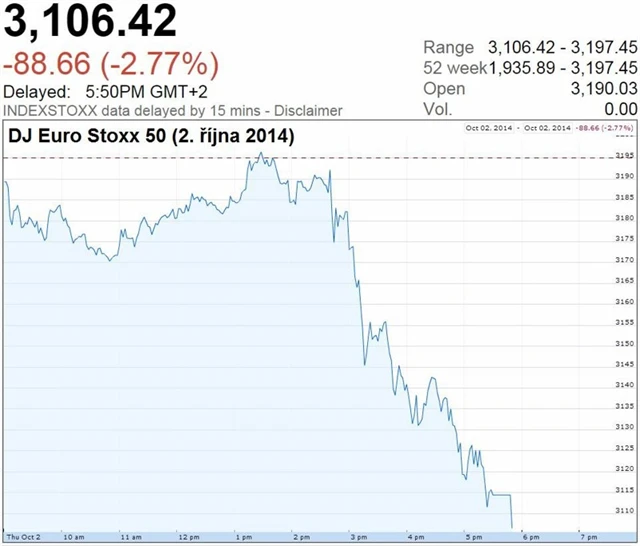 Evropským akciím se ve čtvrtek nedařilo. Dopoledne investoři vyčkávali, jaký bude výsledek zasedání Evropské centrální banky, a akcie stagnovaly. Odpoledne ale zamířily prudce dolů. Šéf ECB Mario Draghi během své tiskové konference po konci zasedání banky představil dílčí podrobnosti programu odkupu cenných papírů v eurozóně, jímž chce rozhýbat ekonomiku, neuvedl však, jak objemné nákupy aktiv budou, což bylo pro trhy zklamáním.