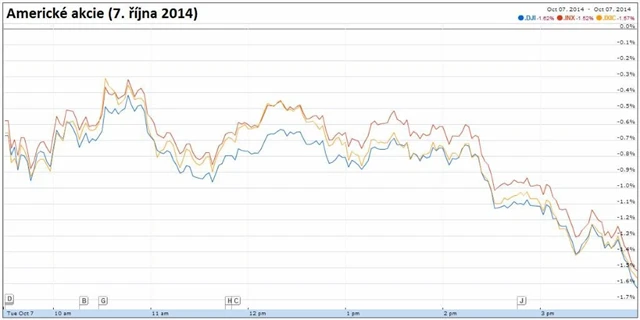 Americké akcie v úvodu úterního obchodování oslabovaly zhruba o šest desetin procenta. Ve druhé polovině seance se přetlak na straně prodejců ještě zvýšil a všechny tři nejsledovanější akciové indexy zamířily prudce dolů. Pro index Dow se jednalo dokonce o nejhorší obchodní seanci za více než dva měsíce. Náladu na trzích ovlivnily nepříznivé údaje o německém průmyslu a také rozhodnutí Mezinárodního měnového fondu zhoršit globální hospodářský výhled na letošní i příští rok.