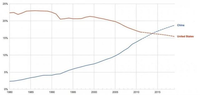 Mezinárodní měnový fond ekonomiky srovnává na základě propočtu HDP tržním měnovým kurzem, ale také na základě jeho kupní síly. A právě ve druhém případě Čína překonala Spojené státy a stala se největší ekonomikou světa. Do konce roku 2014 by měla Čína vytvářet 16,48 % světového HDP přepočteného podle kupní síly (tedy zhruba 17,632 bilionu dolarů), zatímco Spojené státy 16,28 % (tedy zhruba 17,416 bilionu dolarů).