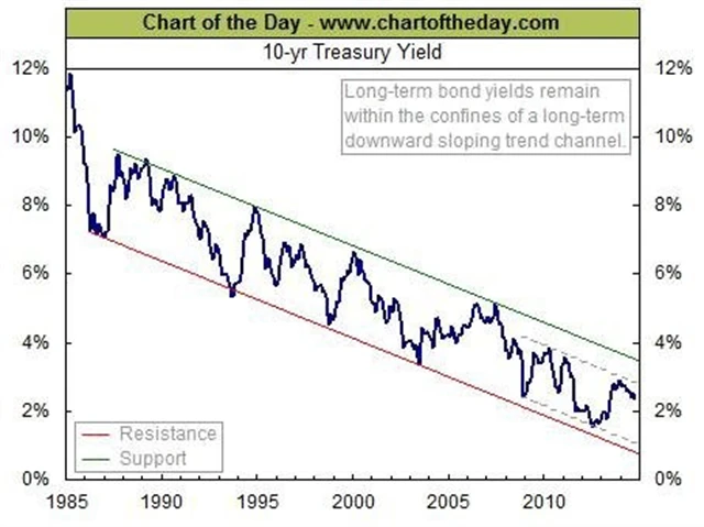 Výnosy amerických státních bondů tak od začátku roku postupně klesají z 3 % na současných asi 2,35 %. Potvrzují tak zhruba 30letý sestupný trend v rámci širokého kanálu, v posledních letech i mírně zúženého (přerušovaný horní trendová linie). Výnosy 10letých státních amerických dluhopisů jsou na podobné úrovni jako v krizovém roce 2008. Z globálního hlediska je úsměvné, že bondy evropských zemí včetně jižního křídla eurozóny vynášejí srovnatelně, nebo dokonce ještě méně.