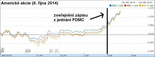 Akcie v reakci na zápis z jednání FOMC začaly prudce posilovat. "Bance její v zápisu vyjádřená pozice dává mnohem více prostoru pro holubičí rétoriku a politiku. Trh to tak vnímá," uvedl Douglas Cote, stratég z Voya Investment Management.