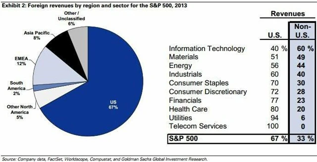 Třetina příjmů firem z indexu S&P 500 je vytvářena mimo USA. Nejvyšší podíl tržeb ze zahraničí (60 %) má technologický sektor, následuje odvětví základních materiálů, těžaři a zpracovatelé surovin. Naopak nulový podíl tržeb ze zahraničí má sektor telekomunikací.