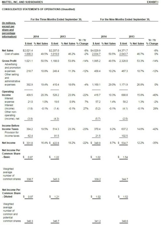 Čisté tržby klesly o osm procent na 2,02 miliardy USD. Mattel na počátku letošního roku přišel o pozici největšího výrobce hraček na světě podle tržeb. Z této pozice ho sesadila dánská společnost Lego Group, upozornila agentura Reuters.