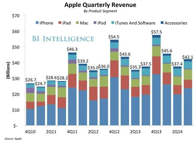 Tržby americké technologické společnosti Apple za čtvrté čtvrtletí jejího fiskálního roku dosáhly 42,1 miliardy dolarů a předčily očekávání analytiků. Vzhůru je tlačil zvláště úspěšný prodej nové generace chytrých telefonů iPhone 6 a iPhone 6 Plus, jichž si lidé koupili téměř o půldruhého milionu kusů více, než se předpokládalo. Čistý zisk firmy meziročně vzrostl o více než 13 %.