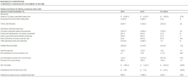 Tržby společnosti McDonald's ve třetím čtvrtletí nenaplnily odhady. Dosáhly pouze 6,99 miliardy dolarů oproti 7,32 miliardy v předchozím roce. Celkově prodeje fastfoodového řetězce klesly v září o 3,8 %, jen ve Spojených státech se snížily o 4,1 %, čekal se pokles o 2,8 %.