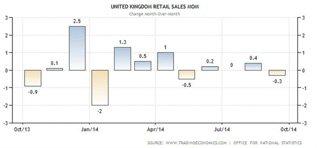 Maloobchodní tržby ve Spojeném království v září klesly meziměsíčně o 0,3 %, očekával se pokles o 0,1 % po srpnovém 0,4% růstu. Meziročně se zvýšily o 2,7 %, očekával se 2,9 % růst. Bez zahrnutí aut meziměsíčně tržby klesly o 0,3 %, očekával se stagnace po srpnovém 0,2% růstu, meziročně se pak zvedly o 3,1 %, trh počítal s 3,4% růstem.