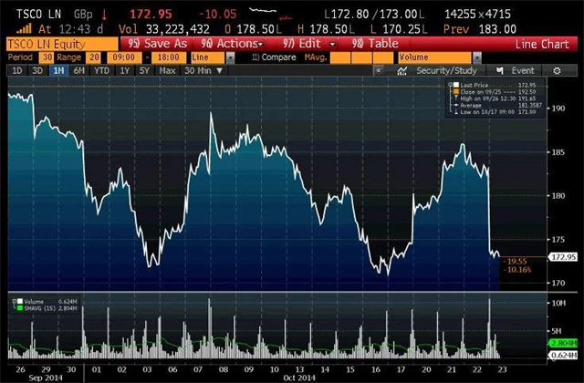 Tesco bylo od 90. let tahounem britského maloobchodu a od té doby také bylo miláčkem investorů, alespoň do doby, kdy jeho zisky nepřetržitě rostly. Za posledního dva a půl roku však firma vydala několik varování před horším ziskem kvůli ztrátě podílu na britském trhu na úkor německých diskontních obchodů Aldi a Lidl i dražších domácích konkurentů.