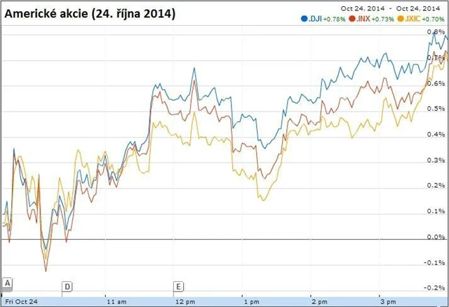 Dow si v pátek připsal 0,76 %, S&P 500 0,70 % a technologický Nasdaq 0,69 %. Nejlépe si v indexu Dow vedly akcie firem Procter & Gamble, 3M, Microsoft a Pfizer, ztrácely naopak Visa, Chevron a IBM.
