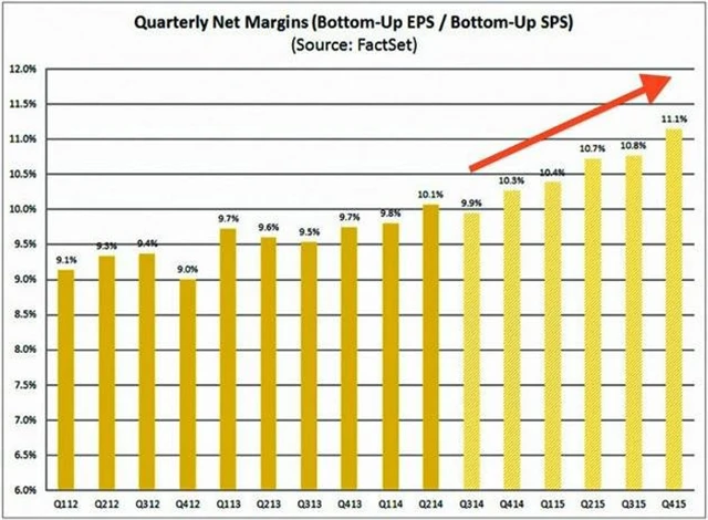 Podle dat společnosti FactSet zisky na akcii ve třetím čtvrtletí vzrostly 5,6% tempem, zatímco tržby jen 3,7% tempem. Marže jsou už nyní poblíž rekordních hladin. Analytici však očekávají, že porostou ještě výše.
