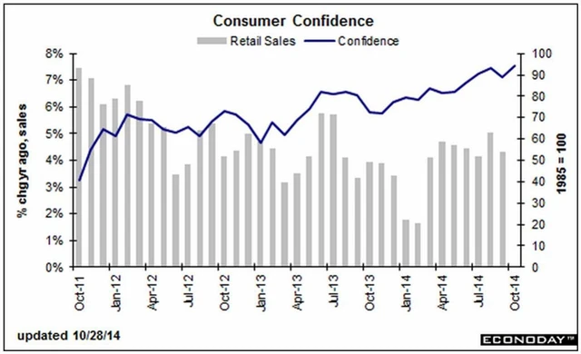 Důvěra amerických spotřebitelů v ekonomiku Spojených států se v říjnu nečekaně zlepšila a stoupla na sedmileté maximum. Index spotřebitelské důvěry vyskočil na 94,5 bodu. Vyplývá to z úterních údajů organizace Conference Board. Trh očekával, že index v říjnu dosáhne jen úrovně 87,5 bodu. Údaj za září byl revidován na 89 bodů z 86 bodů.