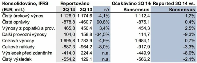 Erste Group Bank hospodařila prvních 9 měsíců letošního roku se ztrátou 1,48 miliardy EUR a s provozním ziskem 5,12 miliardy EUR. Provozní zisk a čistý výsledek Erste Group byl za první tři kvartály roku 2014 v souladu s prognózou. Banka je solidně kapitálově vybavena. Celkově přibývá úvěrů, a naopak ubývá těch nekvalitních. Ve 3Q2014 Erste vykázala ztrátu 554,2 milionu EUR (odhad: 596,9 milionu EUR, loni: zisk 128 milionů EUR), odpisy dosáhly 878,8 milionu EUR a provozní zisk 808,5 milionu EUR (odhad: 767,4 milionu EUR).