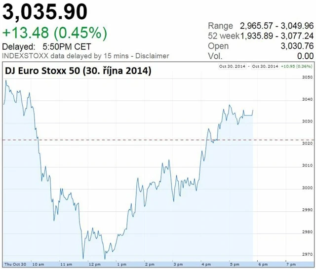 Akciové indexy hlavních evropských trhů v průběhu čtvrteční obchodní seance výrazně kolísaly. Většina akcií začínala mírně v plusu, během dne se ale propadla hluboko do červených čísel, aby se nakonec vyšplhala zpět nad nulu. Investory nejdříve zklamala data o německé inflaci, později jim ale náladu zvedla zpráva, podle které Evropská centrální banka (ECB) již brzy začne nakupovat cenné papíry kryté aktivy (ABS).