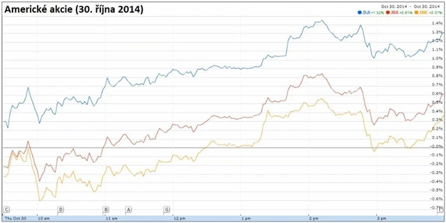 Americká ekonomika rostla ve třetím čtvrtletí tempem 3,5 % anualizovaně, což bylo více, než se čekalo. Mezi investory to zesílilo dohady, že by americká centrální banka mohla zahájit zvyšování úroků dříve, než se dosud předpokládalo. Ve středu Fed naznačil tuto možnost nečekaně optimistickým hodnocením ekonomické situace.