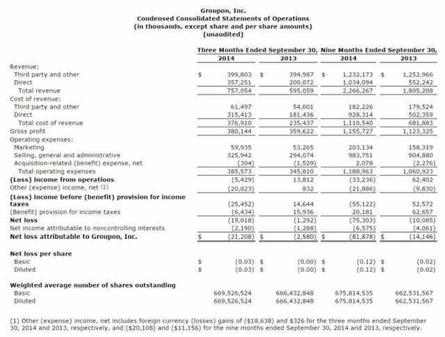 - Výsledky Groupon ve 3Q: Ztráta na akcii 0,03 USD (loni: 0,00 USD), upravený zisk na akcii 0,03 USD, tržby 757,054 milionu USD (loni: 595 milionů USD).