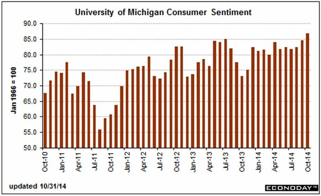 Důvěra amerických spotřebitelů v ekonomiku Spojených států v říjnu dál rostla a vyšplhala se na sedmileté maximum. Index spotřebitelské důvěry Michiganské univerzity vzrostl na 86,9 bodu, nejvýše od července 2007. Čekal se růst indexu na 86,4 bodu z 84,6 bodu v září.
