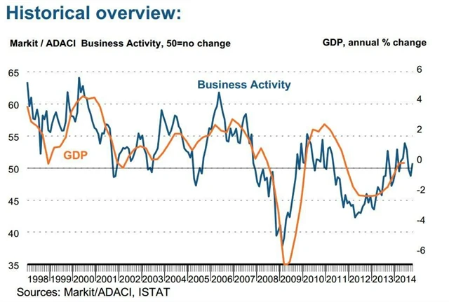 Podmínky v sektoru služeb v Itálii se v říjnu výrazně zlepšily, index nákupních manažerů opět vyskočil nad padesátibodovou hranici, což ukazuje na expanzi celého odvětví. Index se zvýšil na 50,8 bodu ze zářijových 48,8 bodu, očekával se jen mírný růst na 49,4 bodu. Kompozitní index se zvýšil na 50,4 bodu z 49,5 bodu v září. Podle pondělní zprávy agentury Markit se naopak index sledující situaci ve zpracovatelském sektoru propadl zpět pod padesátibodovou hranici na 49 bodů ze zářijových 50,7 bodu.