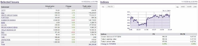 Nejvíce se dařilo akciím ČEZ (+2,16 %), Philip Morris ČR (+1,58 %) a Erste Group Bank (+1,28 %). Největším poraženým dne byla Komerční banka (-0,20 %), mírně ztratily také Pivovary Lobkowicz (-0,03 %). Cena akcií dalších šesti titulů zůstala beze změny.