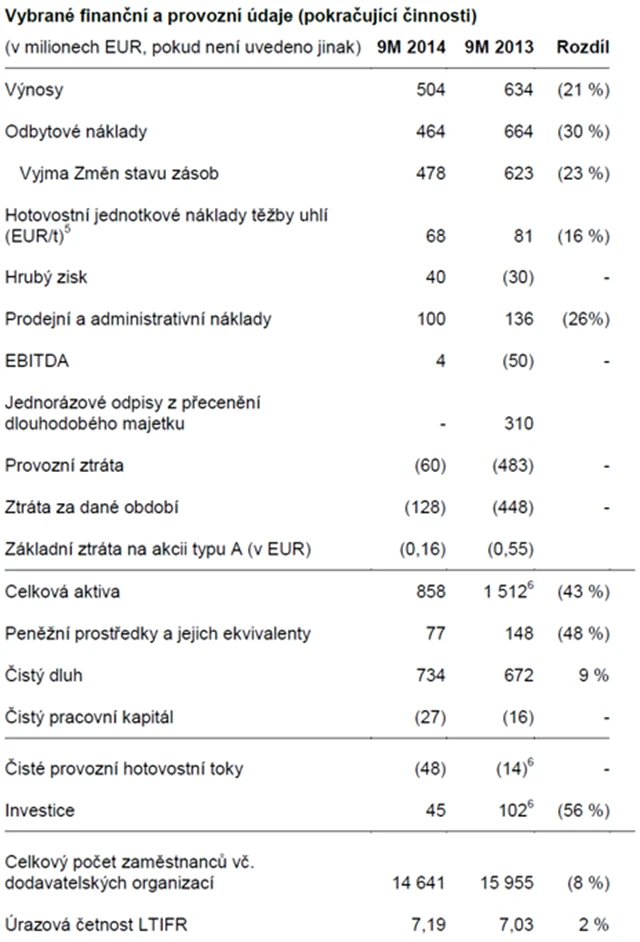 Majitelka černouhelné firmy OKD za tři čtvrtletí letošního roku snížila ztrátu na 128 milionů EUR z 528 milionů EUR před rokem. Snížení tržeb na 504 milionů EUR firma přičítá poklesu cen uhlí na světových trzích, ztráta klesla díky snižování nákladů. "Na provozní úrovni se nám podařilo stlačit jednotkové hotovostní náklady na těžbu o 16 % a administrativní a prodejní náklady o 26 %, čímž jsme za devět měsíců letošního roku dosáhli kladného výsledku EBITDA," uvedl předseda představenstva NWR Gareth Penny.