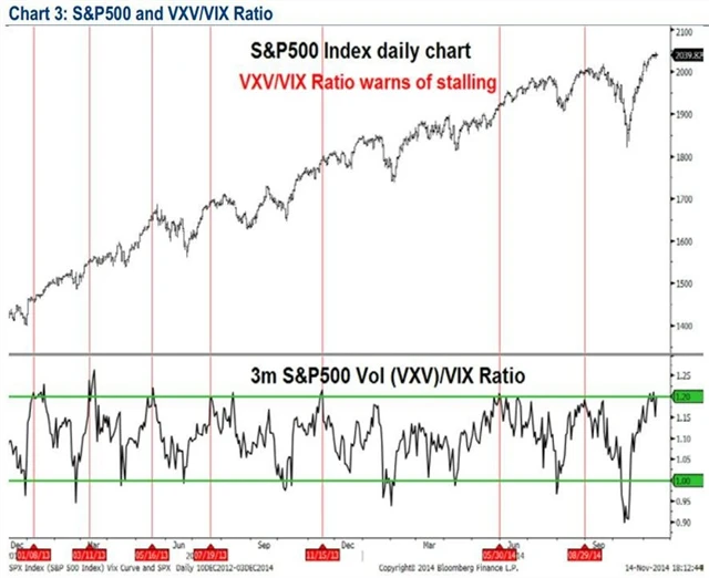 "Náš výhled pro americké akcie je stále optimistický, index S&P 500 by ke konci roku měl podle nás testovat hladinu okolo 2 080 až 2 100 bodů," připomíná Curry. "Krátkodobý vývoj volatility ale zavání velkým sebeuspokojením traderů a investorů. Poměr VXV (3měsíční volatility S&P 500) a indexu VIX (aktuální volatility) je na úrovni, která v minulosti předznamenávala korekce, nebo alespoň zastavení růstu cen akcií."