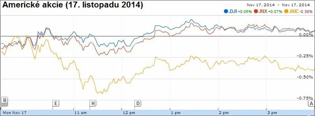 S výjimkou technologického trhu Nasdaq se americké burzy v pondělí pohybovaly kolem nuly. Indexy Dow a S&P 500 posílily shodně o 0,07 %, pro druhý jmenovaný šlo letos o 42. historické zavírací maximum. Akcie byly odpoledne podpořeny slovy šéfa ECB Maria Draghiho o možnosti skupování evropských vládních dluhopisů. To převážilo i negativní sentiment pramenící z toho, že se japonská ekonomika ve třetím kvartálu vrátila do recese.