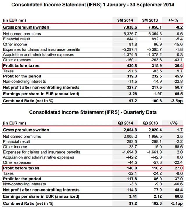 Čistý zisk zaznamenal silný růst na 114 milionů EUR ve 3Q2014 a překonal odhady. Kombinovaný poměr se zlepšil v uplynulých třech kvartálech na 97,2 % (oproti 100,6 % v 1-3Q2013).