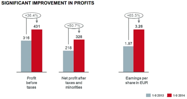 Finanční výsledek byl v souladu s odhady 293 milionů EUR. Zisk před zdaněním stoupl na 140 milionů EUR ve třetím kvartálu 2014, a zaostal tak za očekáváními.