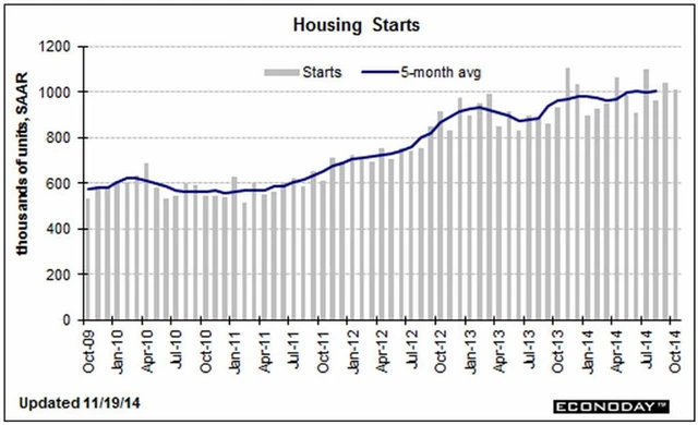 Zahájená výstavba ve Spojených státech v říjnu klesla o 2,8 % na 1,01 milionu jednotek anualizovaně. Očekával se výsledek 1,03 milionu jednotek po 1,04 milionu jednotek v září (revidováno z 1,02 milionu jednotek). Počet vydaných stavebních povolení ale vzrostl o 4,8 % na 1,08 milionu anualizovaně z 1,03 milionu (revidováno z 1,02 milionu). Říjnový výsledek je tak nejlepší za zhruba šest a půl roku. Čekal se růst na 1,04 milionu.