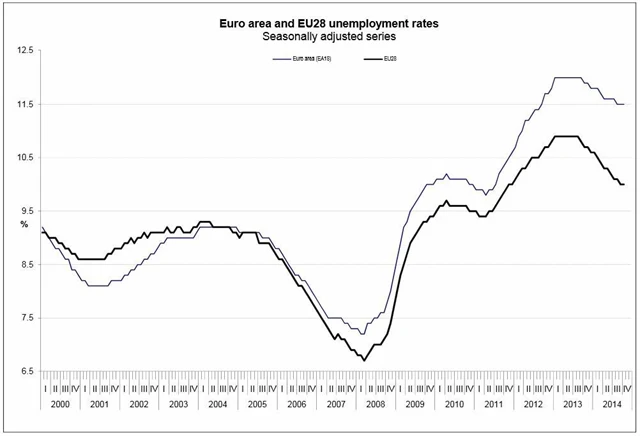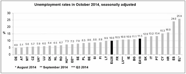 Podle statistik Eurostatu bylo v říjnu v Evropské unii bez práce 24,413 milionu lidí, z toho 18,395 milionu v samotné eurozóně. V meziměsíčním srovnání tak počet nezaměstnaných v eurozóně vzrostl o 42 tisíc a v celé Evropské unii se zvýšil o 60 tisíc. V meziročním srovnání ale počet nezaměstnaných v eurozóně klesl o 547 tisíc a v celé EU28 o 1,549 milionu.