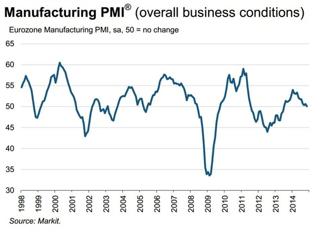 Zpracovatelský sektor v eurozóně v listopadu téměř stagnoval. Index nákupních manažerů klesl na 50,1 bodu, tedy pouhou desetinu bodu nad hranici dělící kontrakci od expanze. Expanzi Španělska, Irska a Nizozemska vyvážila kontrakce ostatních velkých sledovaných států.