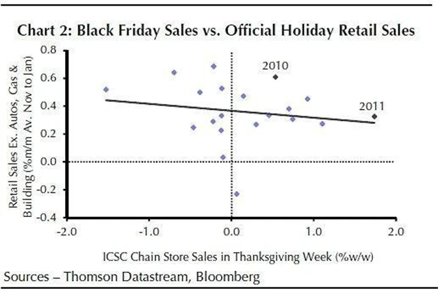 Graf ukazuje týdenní změnu v tržbách v týdnu zahrnujícím Den díkůvzdání (osa X) a průměr měsíční změny tržeb v období od listopadu do ledna (osa Y). Chybějí roky 2012 a 2013, graf je starší, ale ukazuje celkem dobře velký rozptyl, který mají jednotlivé roky na grafu (čtverečky).