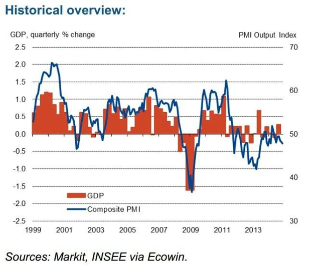 Podmínky v sektoru služeb ve Francii byly v listopadu nadále nepříznivé. Index nákupních manažerů dále klesá, a to na devítiměsíční minimum 47,9 bodu z říjnových 48,3 bodu, předběžná data počítala s růstem na 48,8 bodu. Kompozitní index se snížil rovněž na 47,9 bodu z 48,2 bodu v říjnu, předběžná data predikovala 48,4 bodu. Podle pondělních dat se dále zhoršily i podmínky ve zpracovatelském sektoru, kde se index propadl na 48,4 bodu z 48,5 bodu v říjnu.
