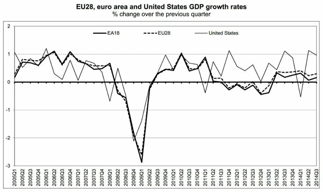 Evropská centrální banka (ECB) ve čtvrtek snížila odhad letošního růstu ekonomiky eurozóny na 0,8 % z dříve předpokládaných 0,9 %. V příštím roce počítá se zrychlením růstu na jedno procento, v roce 2016 by měl růst činit 1,5 %. To představuje výrazné zhoršení ve srovnání s předchozí zářijovou prognózou, podle které měla ekonomika napřesrok stoupnout o 1,6 %, a v roce 2016 dokonce o 1,9 %.