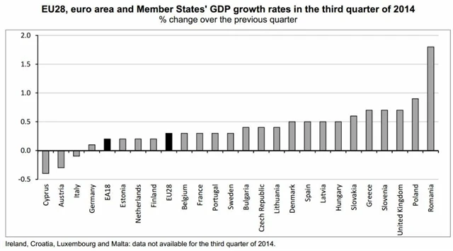 Z celé Evropské unie ve třetím čtvrtletí nejvíce expandovaly ekonomiky Rumunska (+1,8 %), Polska (+0,9 %), Řecka, Slovinska a Spojeného království (všechny +0,7 %). Mezičtvrtletní pokles HDP zaznamenaly ekonomiky Kypru (-0,4 %), Rakouska (-0,3 %) a Itálie (-0,1 %). Hrubý domácí produkt České republiky se ve třetím čtvrtletí mezikvartálně zvýšil o 0,4 %.