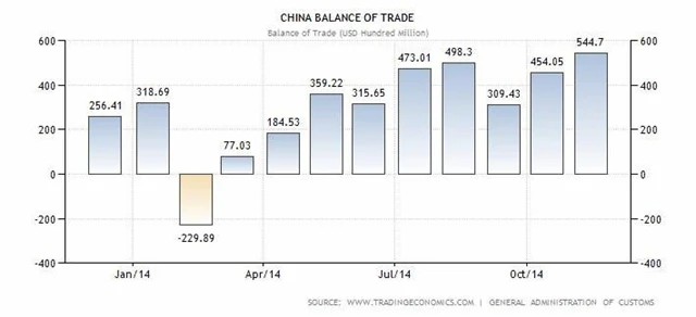 Export vzrostl meziročně jen o 4,7 % (v říjnu +11,6 %, odhad +8,2 %), dovoz dokonce klesl o 6,7 % (odhad +3,9 %, v říjnu +4,6 %). Přebytek obchodní bilance tak celkově narostl na 54,5 miliardy USD (odhad: 43,5 miliardy USD).