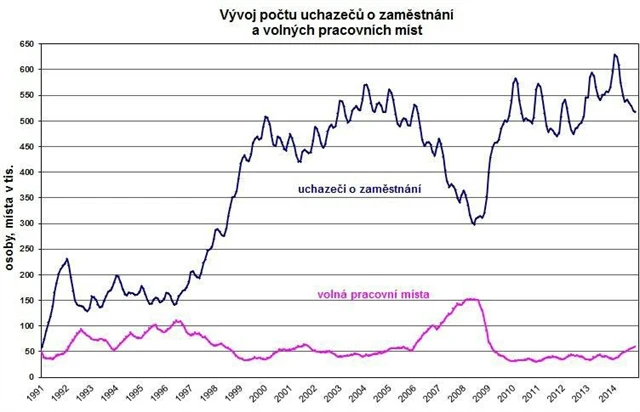 Podíl nezaměstnaných osob, tj. počet dosažitelných uchazečů o zaměstnání ve věku 15 - 64 let k obyvatelstvu stejného věku k 30. 11. 2014 zůstal na 7,1 %. Podíl nezaměstnaných stejný nebo vyšší než republikový průměr vykázalo 34 okresů, nejvyšší byl v okresech Most (12,6 %), Ústí nad Labem a Bruntál (shodně 12,4 %), Karviná (11,9 %), Chomutov (10,9 %) a Ostrava-město (10,8 %). Nejnižší podíl nezaměstnaných byl zaznamenán v okresech Praha-východ (3,3 %), Benešov (3,9 %), Rychnov nad Kněžnou (4,1 %), Pelhřimov a Prachatice (shodně 4,2 %), Mladá Boleslav a Rokycany (shodně 4,3 %). Podíl nezaměstnaných mužů zůstal na 6,8 % a podíl nezaměstnaných žen poklesl na 7,4 %.