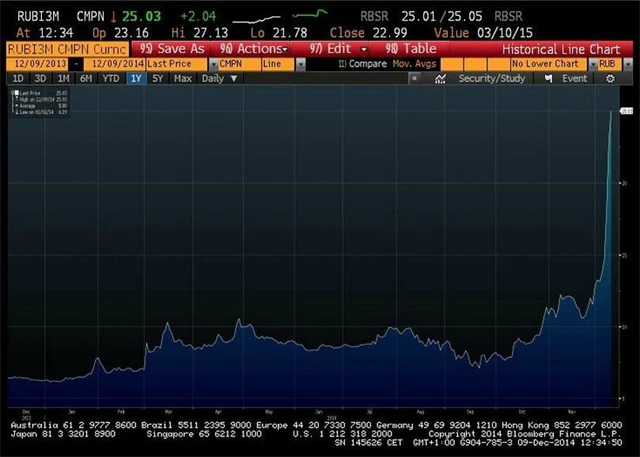Kreditní přirážky k ruským státním dluhopisům jsou téměř 4 % ročně, měřeno 5letými CDS (credit default swap – pojištění proti bankrotu). To je více než kreditní přirážka Iráku (bez ratingu) nebo Libanonu (spekulativní rating), tedy zemí ohrožovaných Islámským státem. Vzhledem k nízkému státnímu dluhu Ruska (asi 10 % HDP) tak trh započítává realistickou možnost zavedení omezení pohybu kapitálu.